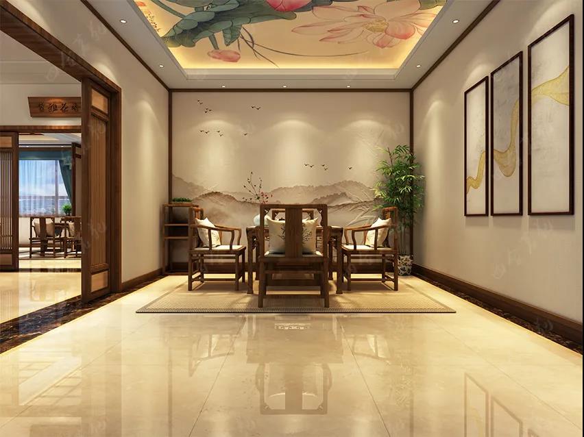 本案按照將新中式糅合于新古典的思路,從簡單到復雜,從整體到局部,精雕細琢,給人一絲不茍的印象。一方面在材質、色彩的大致風格上,仍然可以從中強烈地感受傳統的歷史痕跡與渾厚的文化底蘊,同時又摒棄了過于復雜的肌理和裝飾。